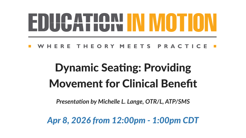 Join OT Michelle Lange for “Dynamic Seating: Providing Movement for Clinical Benefit” for wheelchair as presented in the Sunrise Medical Education in Motion free webinar series. Earn .1 CEU.